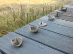 完成した作品をウッドデッキに並べて乾燥中。子供の想像力と創造力はオモシロイ。