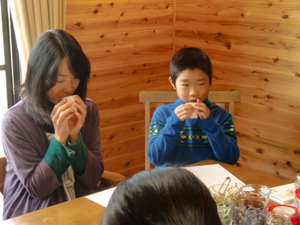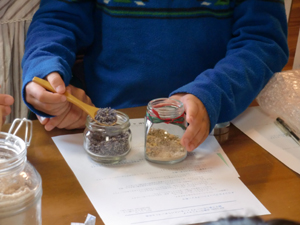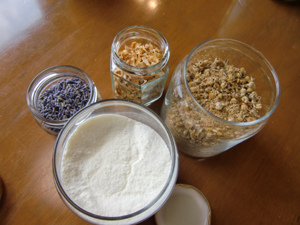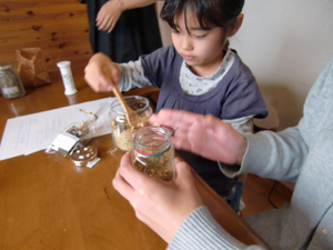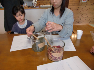 次は、米ぬかやミルクパウダーにハーブで香りをつけるバスパウダーづくり。