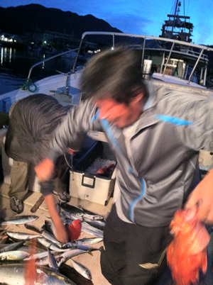 釣りの朝は早いです。真っ暗の港に到着し、竿や道具を積み込み