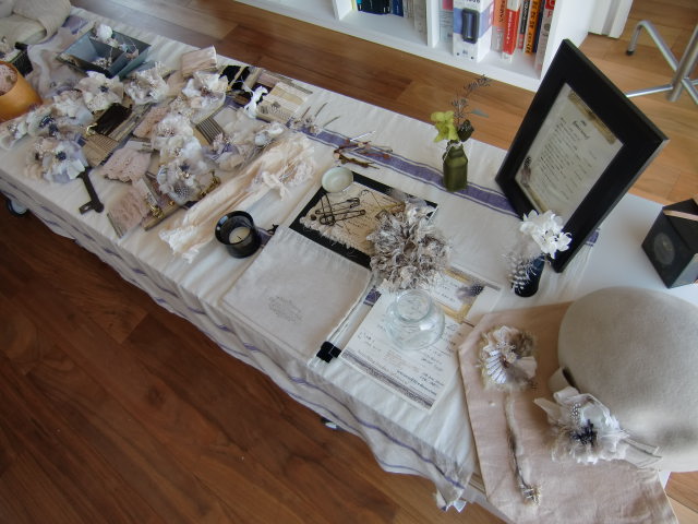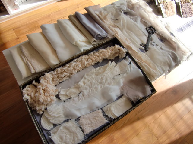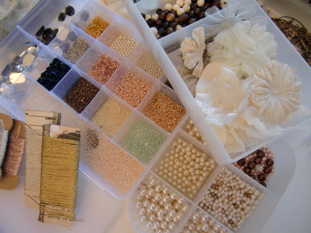 sonoさんが用意してくれた様々なビジュー、ビーズ、布、アートフラワーなどの素材の中から