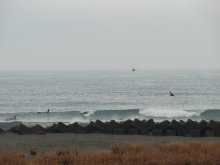 強烈なオフショアと戦う左からniwarin,kei,takashi。