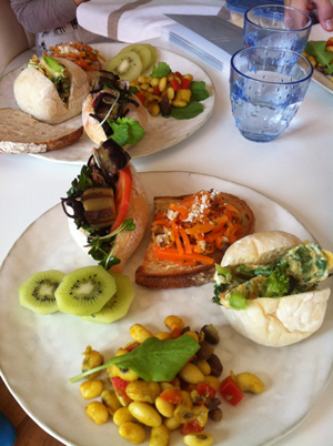 ズッキーニと卵の白いパンサンド、新玉とセロリの豆乳ポタージュ、玄米サラダ!