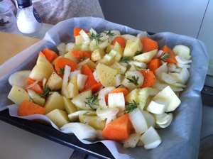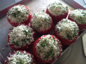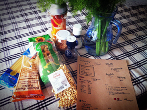 メニューはトマトのオーブン焼き、ピクルス、ほうれん草のパスタ、阿波地鶏ロースト。