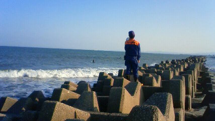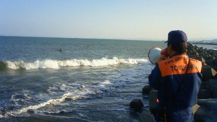 消防隊員「コラーッ!海から上がれーっ!」(ってな感じでしょうか?)