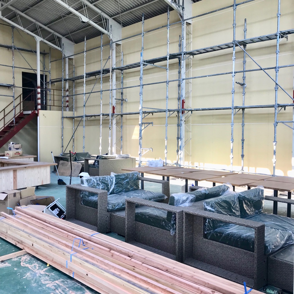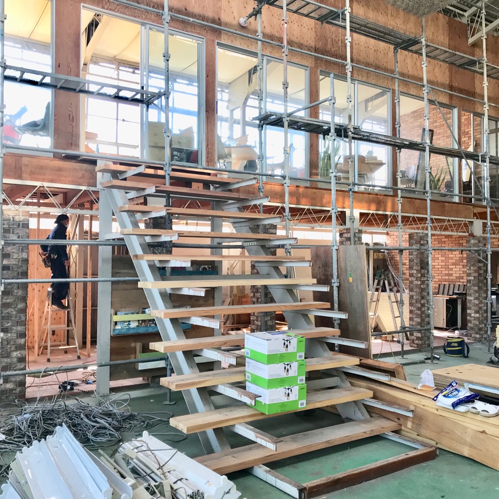 倉庫を店舗に改装中。現在、中央にある大きな階段が出来上がりつつあります。大空間がどのように生まれ変わるかは、来月をお楽しみに!