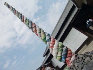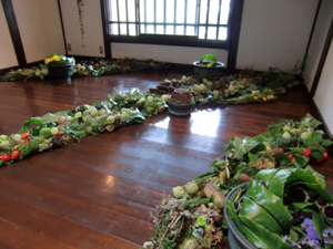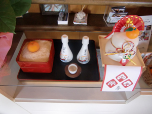 写真右は竹富島の正月飾りのお餅。横にお米も飾るのが一般的だそう。