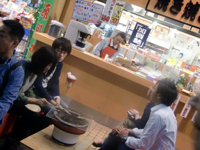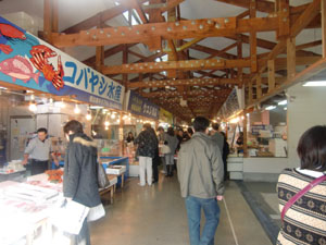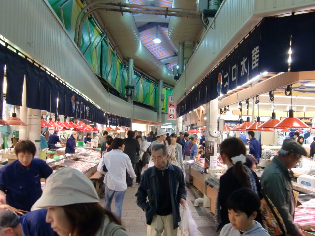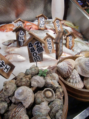 市場で買ったばかりの魚を店前の七輪で炙って食べることもできます。