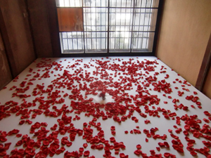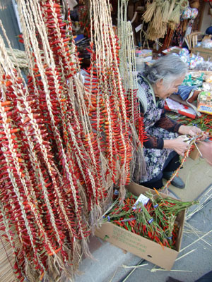 唐辛子を丁寧に藁に編みこんでいたおばあさん、絵になります。