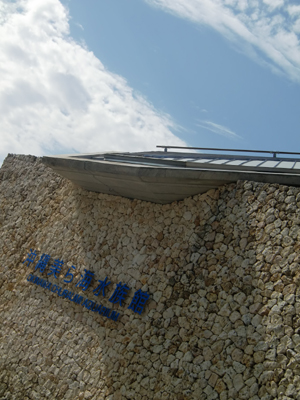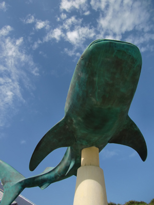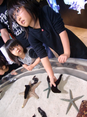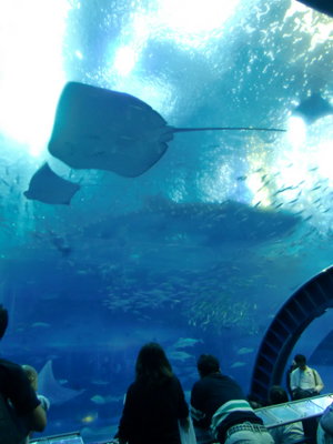 定番の美ら海水族館。天気がよくってジンベエザメも空を泳いでます。娘2人はナマコに夢中。