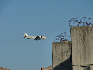戦闘機が爆音とともに何度も飛んでいく。その下で地元の保育園児たちが散歩…。切ない光景。