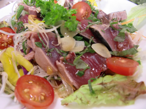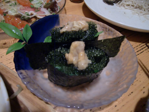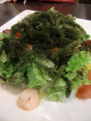 夜には三線ライブ。石垣島で頼むサラダには必ずといっていいほど海ぶどうが。