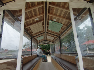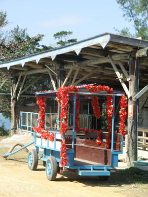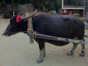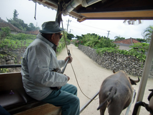 水牛車に乗って島の中心部を見学。おじいの昔話と三線&唄でのんびりのんびり。