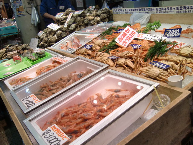 金沢駅からほど近い場所にある近江町市場は、地元の人や観光客で大賑わい。