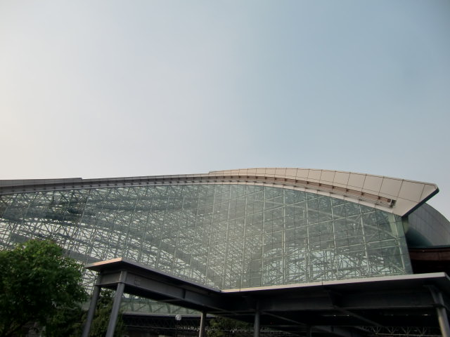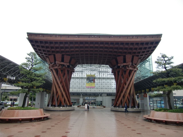 こちらは巨大なガラスに覆われた金沢駅前のもてなしドーム。古都らしさがあふれる木のゲートが。