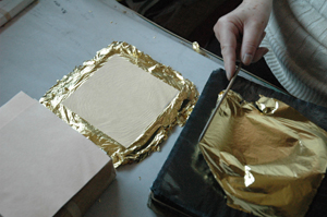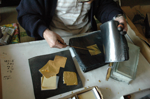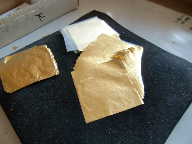 薄くなった金箔はそよ風ですらふわりと浮いてしまうほどの薄さ。