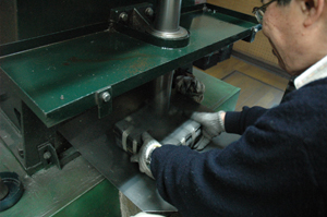 写真左は1000分の1mmの厚さの金。これを束にして機械で1万分の1mmの厚さに伸ばします。