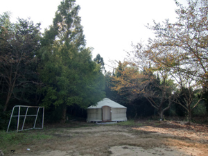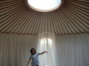 校庭の片隅に設置されたパオの中で、ランダムなサウンドミックスを体感!