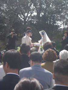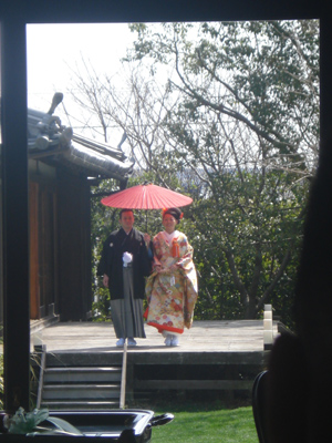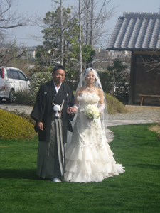 ガーデンの奥から艶やかな色打掛姿の新婦と凛々しい新郎が登場。