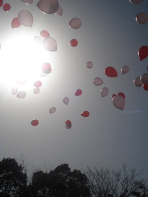 とっても天気がよくって、青い空に元気よく風船が飛び立ちました。
