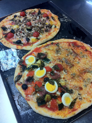 最後に自分たちで材料を選んで盛り付けたオリジナルピッツァを焼いてくださいました(写真右)。